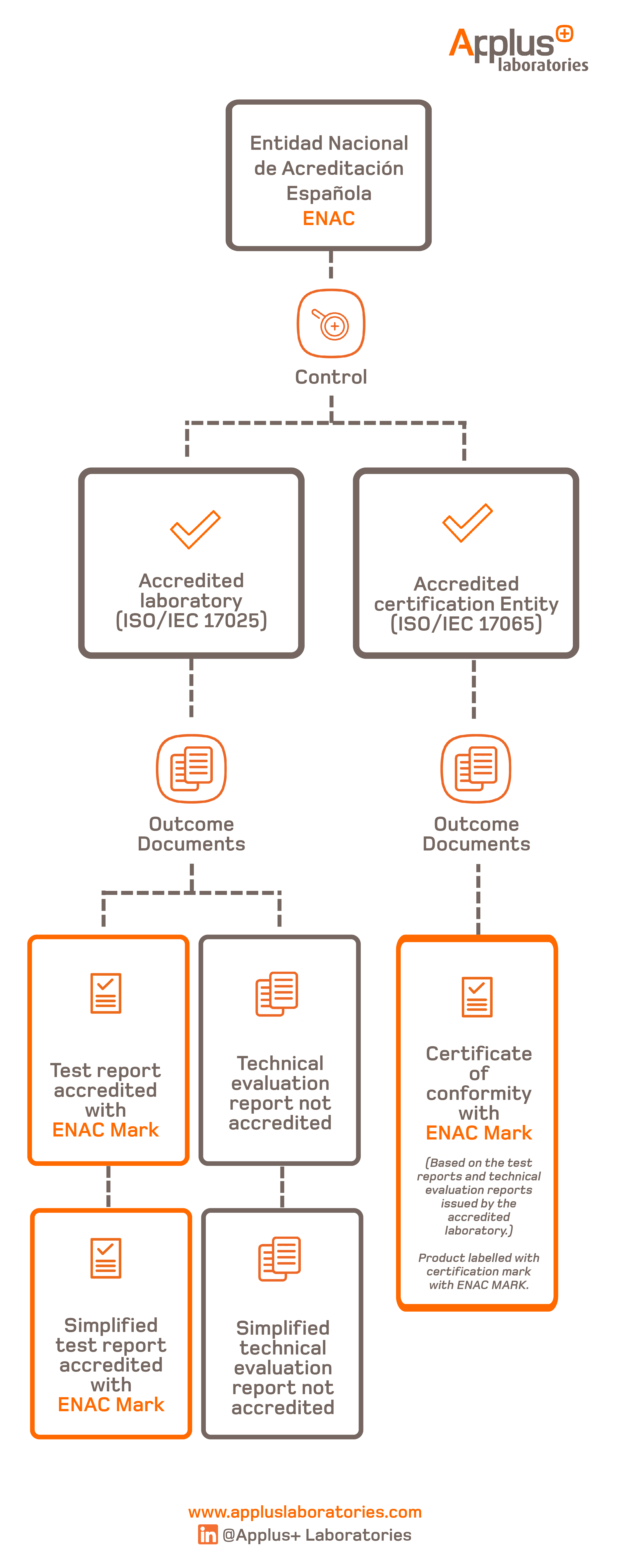 In Spain, ENAC (Entidad Nacional de Acreditación Española) is the organization in charge of accrediting entitities like laboratories and certification bodies. Through this process of accreditation, it ensures the laboratories' technical competence to carry out the tests in accordance with the accredited standards in its scope. As for certification bodies, it ensures that these have the technical competence to certify that the products comply with the requirements established in the standards. The physical end product of these accreditation processes is the relevant documentation ENAC issues as evidence of this competence.